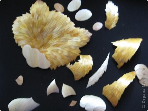 1. Впервые с техникой "чесаной соломки" я столкнулась в журнале "Школа и производство" за 2003год (№4).Применяется эта техника для имитации оперения птиц и меха животных. Эта техника состоит в следующем: разглаженные соломины нарезаются на части длиной 1,5-2см, один край выстригается зубчиками, а затем необходимая деталь заклеивается этими частичками, перекрывая друг друга.